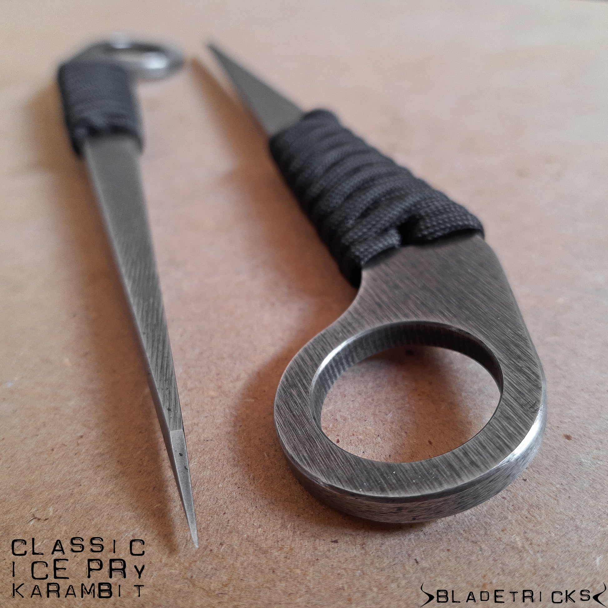 This pointy Ice Pry Karambit version is made from 5 mm thick O1 tool steel (a steel designed for tool making) and has been rigorously heat treated in our workshop in a digitally controlled kiln.